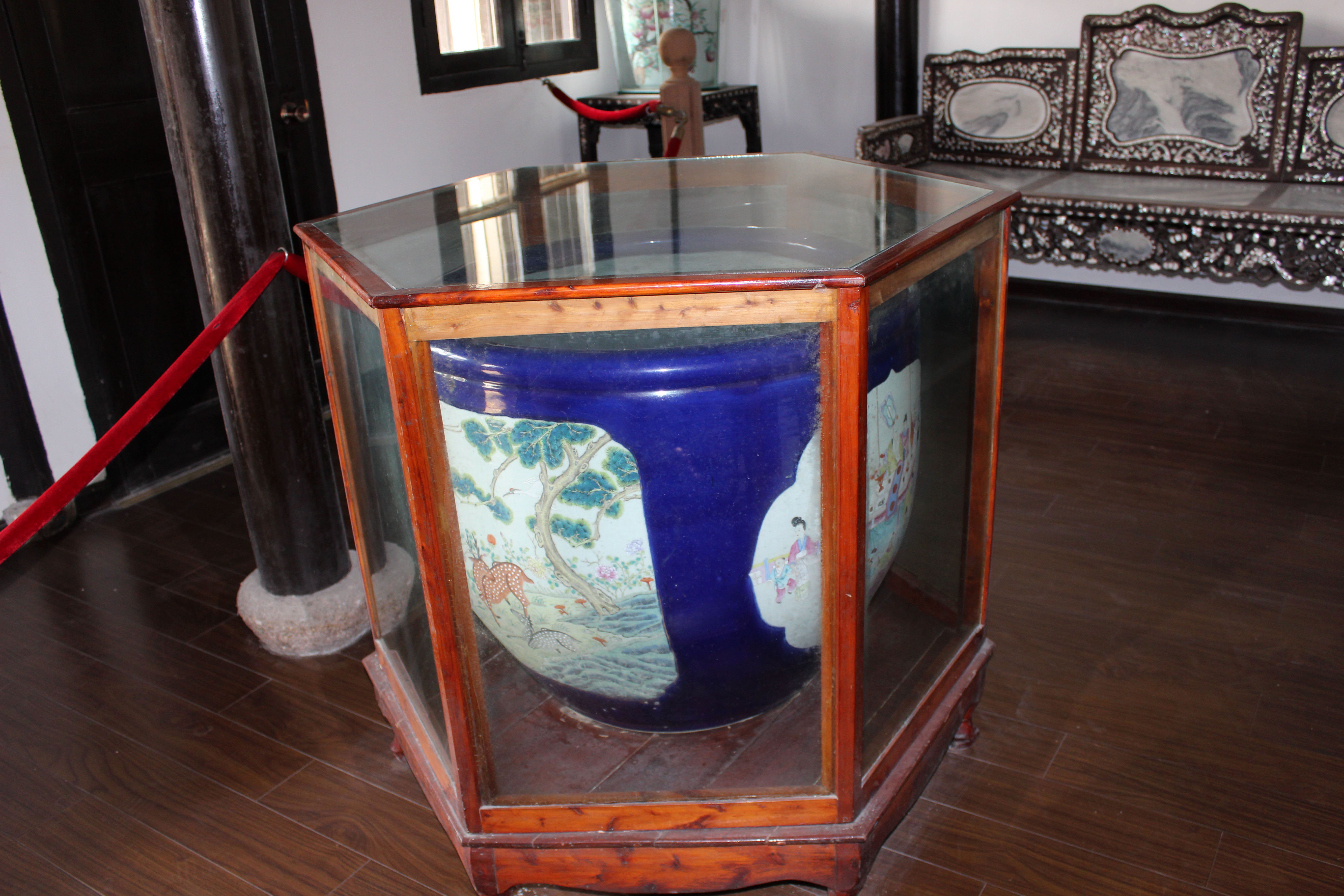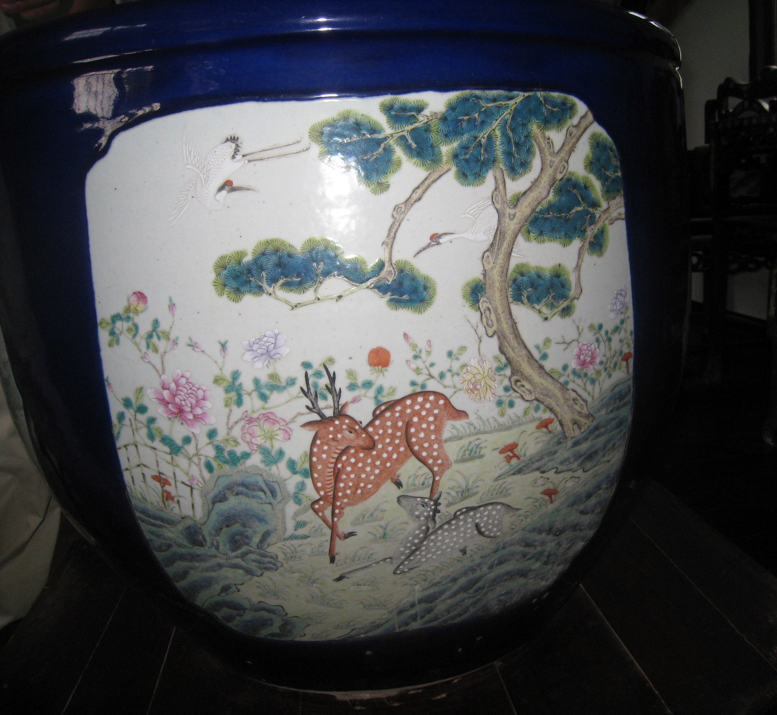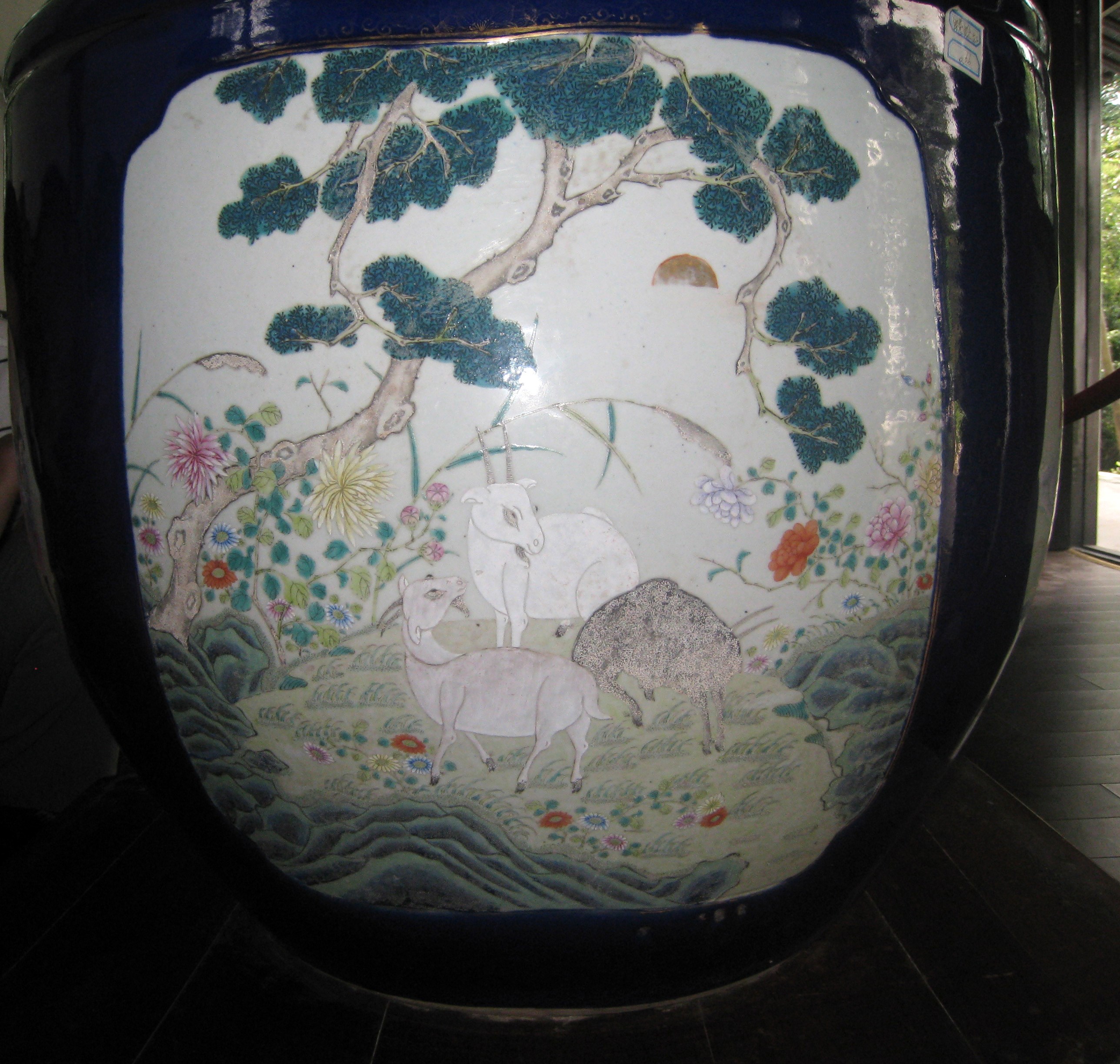 粉彩九蟾缸,可以说在我们啬园珍藏的文物里,这口缸是最具有价值的,所以它位居啬园三宝之首。这口缸摆在张氏飨堂的东侧厢房的正中央。说起它的作用,既不是用来种花植草,也不是用来养鱼喂龟,而是古人用来存放字画的。 “粉彩九蟾缸”属于粉彩瓷,而粉彩瓷又叫软彩瓷,是景德镇窑四大传统名瓷之一。 九,在中国古代,九为阳数的极数,于是多用九这一数字来附会帝王。九是皇室的专属,平民百姓丝毫不可僭越。而我们所见到的这口缸正是清朝末年慈禧太后在60岁大寿之时赐予张謇先生的,因为张謇先生正是在那一年考取状元功名,因而获得嘉奖。 在缸的内壁画有九只蟾蜍,在中国古代蛙与蟾蜍统称蛤蟆。蛙既可以在水中,又可以到陆地,跳跃似飞禽,古人觉得它上天入地无所不能。此外蛙繁殖量大,肚腹浑圆膨大,与孕妇形态相似,蛙卵繁多,古人就觉得蟾蜍象征着多子多福,而对其倍加喜爱。 除此之外,在这口缸的外壁上画有四幅画,这些画都有着不同的吉祥寓意。 鹿鹤同春:谐音六合同春,六合泛指天下。天下皆春,万物欣欣向荣。 三羊开泰:谐音三阳开泰,意思是好运即将降临。 九世同堂:即家和万事兴的寓意。 瑶池相会:画着的是西王母和周穆王在瑶池相会的场景,寓意着长寿。 |