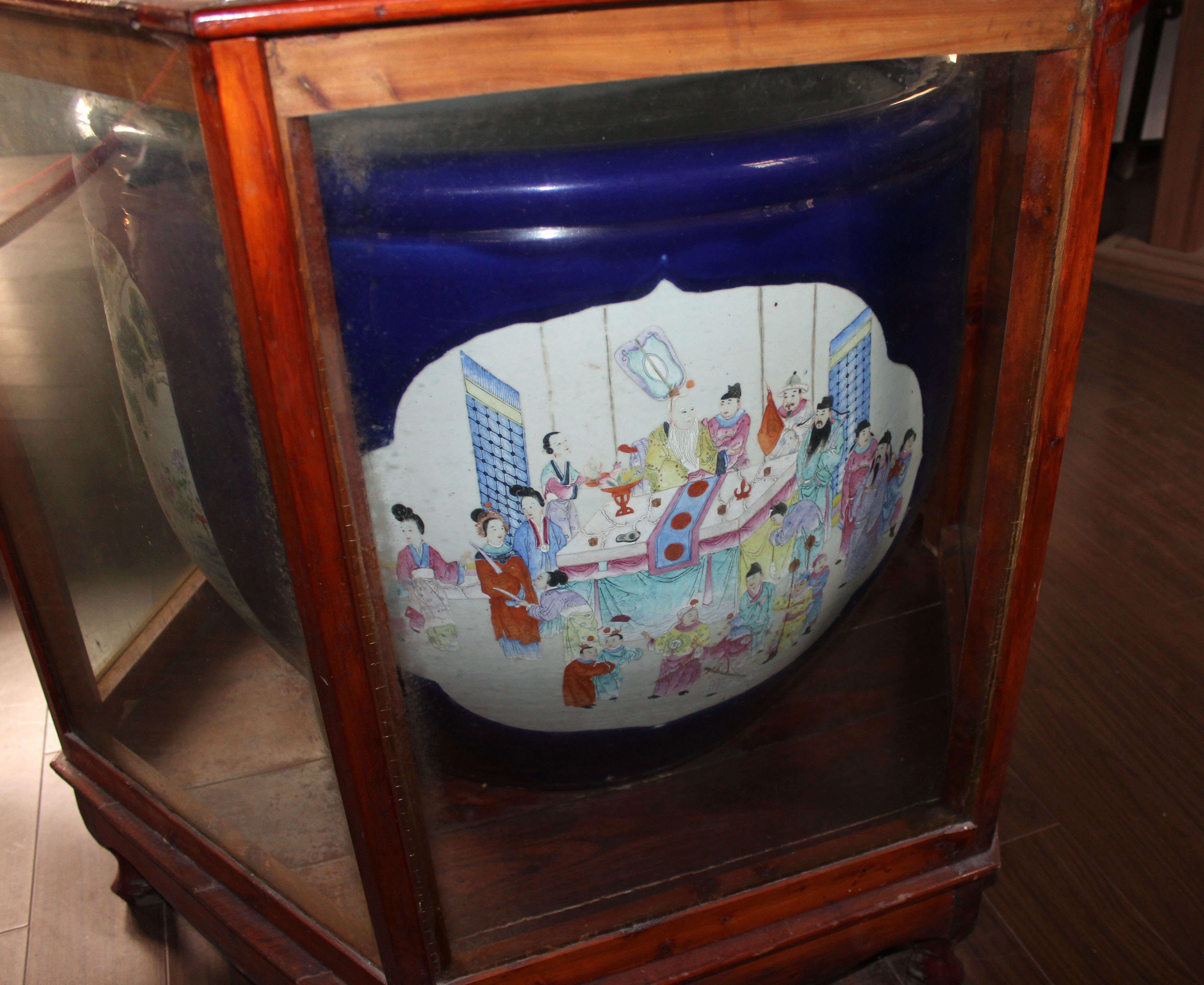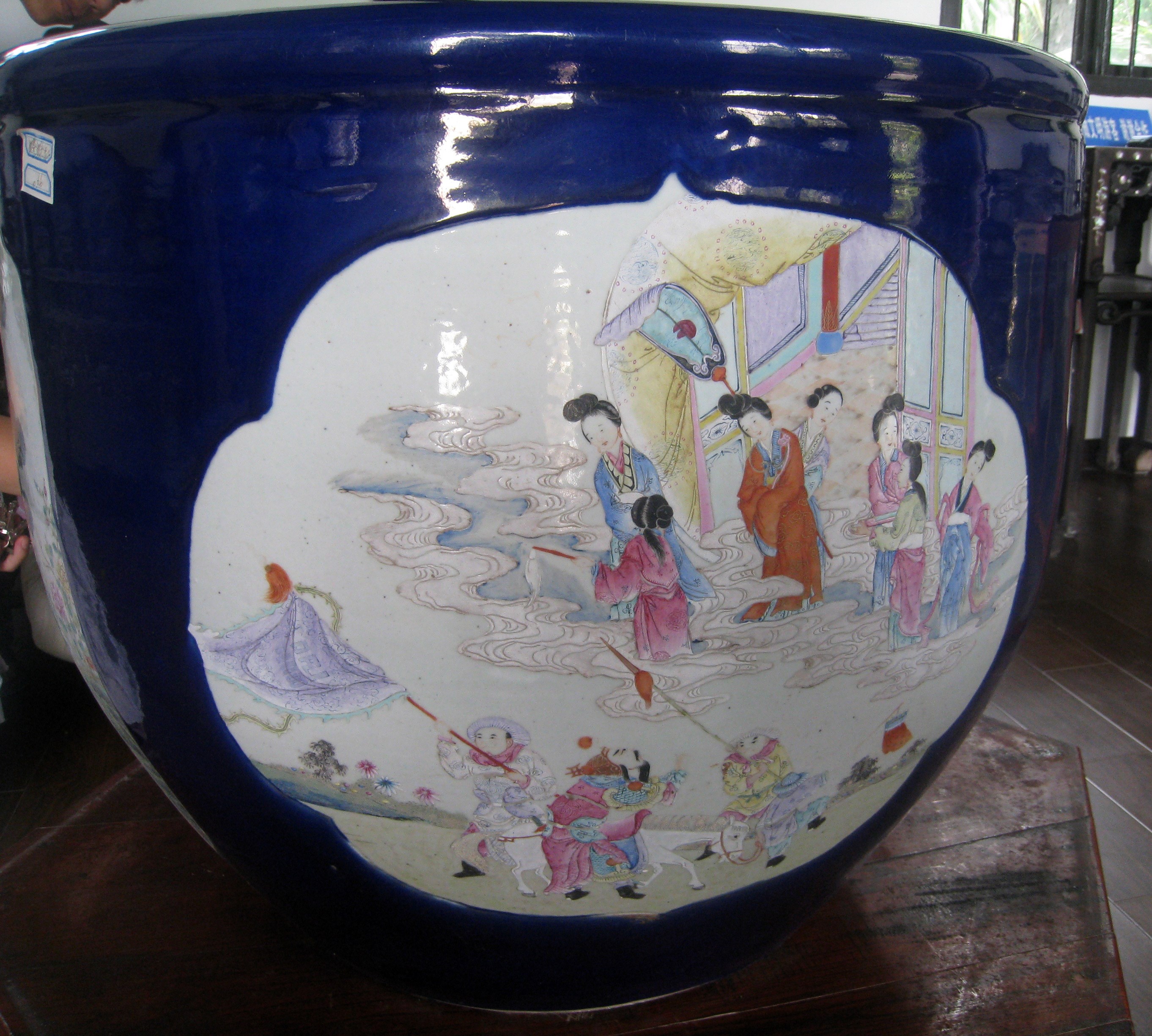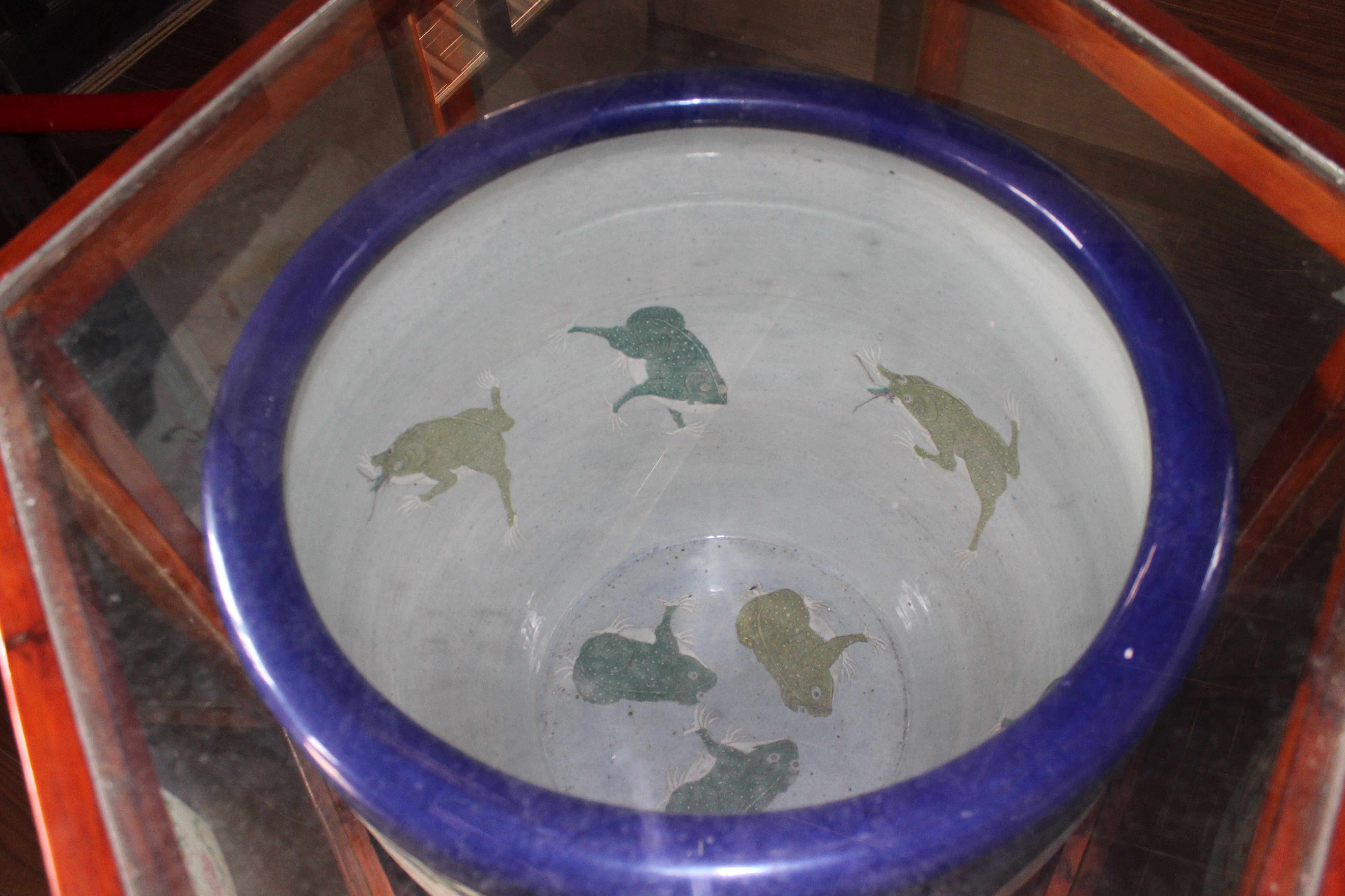 粉彩九蟾缸,可以说在我们啬园珍藏的文物里,这口缸是最具有价值的,所以它位居啬园三宝之首。这口缸摆在张氏飨堂的东侧厢房的正中央。说起它的作用,既不是用来种花植草,也不是用来养鱼喂龟,而是古人用来存放字画的。 “粉彩九蟾缸”属于粉彩瓷,而粉彩瓷又叫软彩瓷,是景德镇窑四大传统名瓷之一。 九,在中国古代,九为阳数的极数,于是多用九这一数字来附会帝王。九是皇室的专属,平民百姓丝毫不可僭越。而我们所见到的这口缸正是清朝末年慈禧太后在60岁大寿之时赐予张謇先生的,因为张謇先生正是在那一年考取状元功名,因而获得嘉奖。 在缸的内壁画有九只蟾蜍,在中国古代蛙与蟾蜍统称蛤蟆。蛙既可以在水中,又可以到陆地,跳跃似飞禽,古人觉得它上天入地无所不能。此外蛙繁殖量大,肚腹浑圆膨大,与孕妇形态相似,蛙卵繁多,古人就觉得蟾蜍象征着多子多福,而对其倍加喜爱。 除此之外,在这口缸的外壁上画有四幅画,这些画都有着不同的吉祥寓意。 鹿鹤同春:谐音六合同春,六合泛指天下。天下皆春,万物欣欣向荣。 三羊开泰:谐音三阳开泰,意思是好运即将降临。 九世同堂:即家和万事兴的寓意。 瑶池相会:画着的是西王母和周穆王在瑶池相会的场景,寓意着长寿。 |